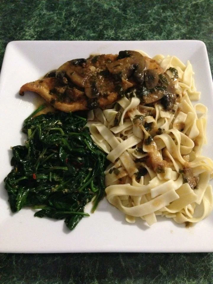 Chicken Marsala with egg noodles and Sautéed Spinach